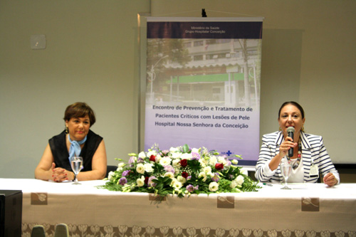 Fizeram parte da mesa de abertura a organizadora do encontro, Maria Cristina Antunes, e a coordenadora da Enfermagem da UTI do Hospital Conceição, Nara de Azeredo. De acordo com Nara, o cuidado é o mais importante no atendimento ao usuário. “É necessário discutirmos sobre como cuidamos e descuidamos dos pacientes com lesões de pele durante o atendimento”, disse Nara.