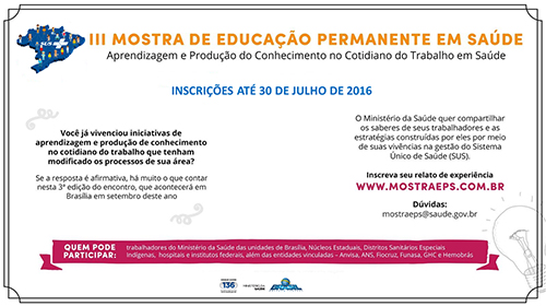 Estão abertas, até o dia 30 de julho, as inscrições para a III Mostra de Educação Permanente em Saúde no Âmbito Federal do SUS, promovida pelo Ministério da Saúde, por meio da Coordenação de Desenvolvimento de Pessoas. O objetivo dessa mostra é reconhecer e dar visibilidade às ações de Educação Permanente em Saúde (EPS) que ocorrem no nível federal do SUS, a fim de fortalecer a EPS como norteadora de novas práticas que orientam a reflexão sobre os processos de trabalho.