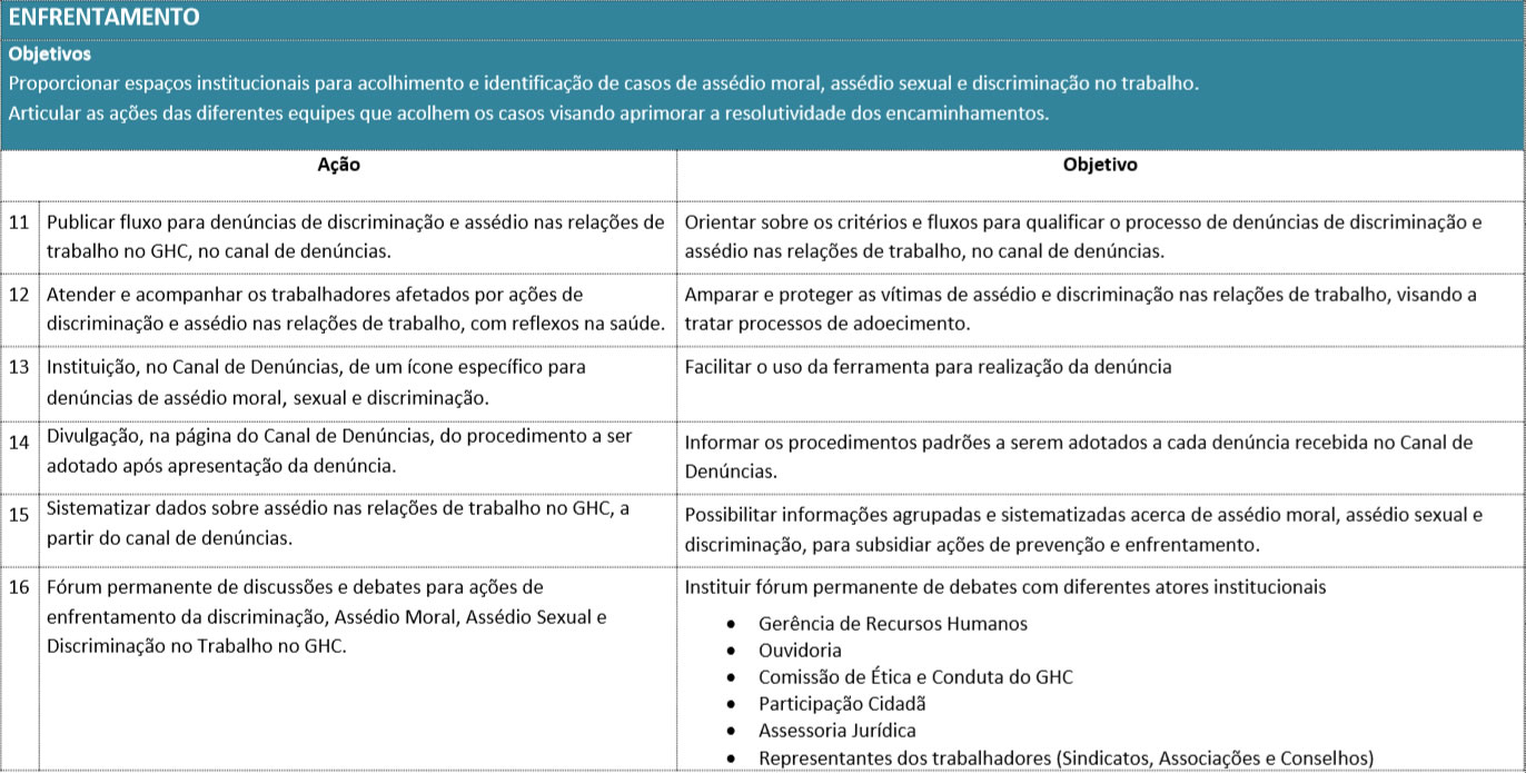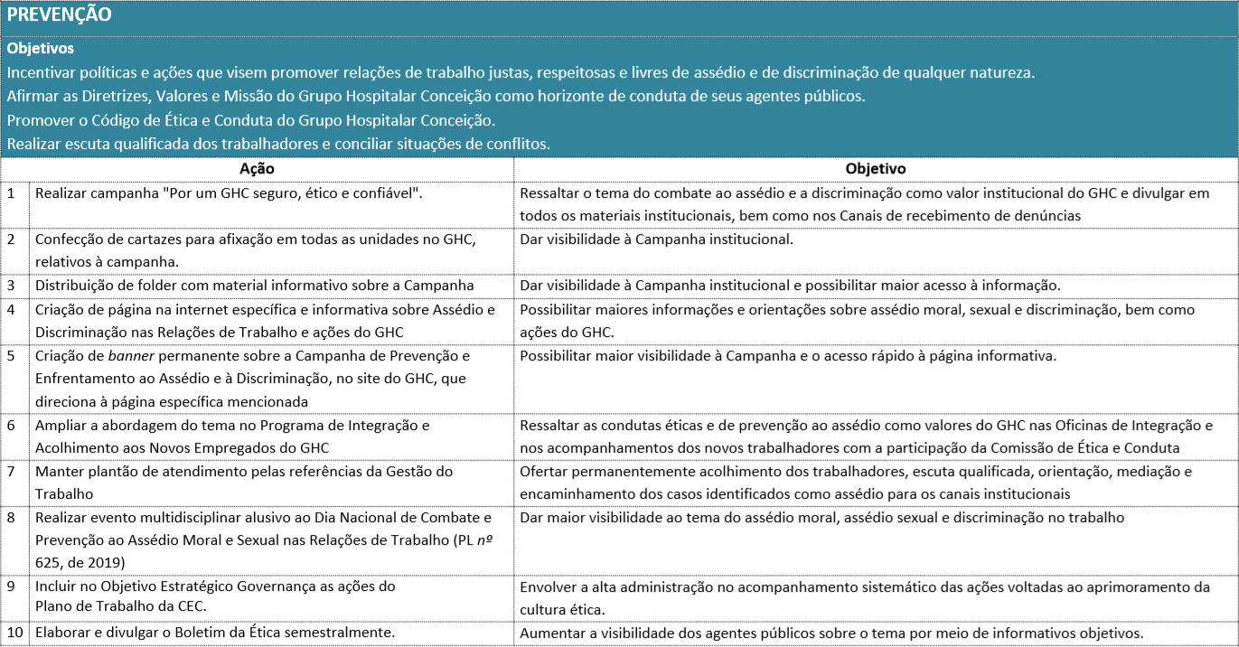 Assim, o GHC afirma padrões de comportamento ético, em conformidade ao seu Código de Ética e Conduta, e, buscando alcançar relações profissionais saudáveis, em ambientes respeitosos e éticos, institui Campanha de Prevenção e Enfrentamento do Assédio e da Discriminação nas Relações de Trabalho no Grupo Hospitalar Conceição.