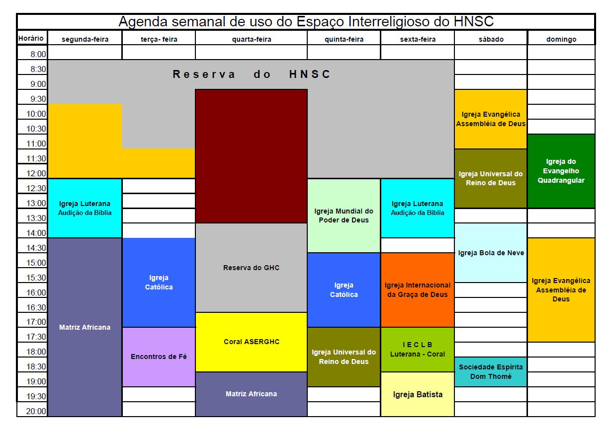 Atualmente, os religiosos realizam os seus trabalhos de acordo com o regimento elaborado juntamente com os representantes das denominações religiosas que compõem o fórum. A assistência é feita nos hospitais do Grupo por meio de celebrações nos espaços inter-religiosos, conforme o calendário de atendimento com escala elaborada de forma a contemplar a todas as denominações. Este calendário está em permanente avaliação e atualização. A visitação aos pacientes é concedida com prévia autorização do setor onde o mesmo esta internado.