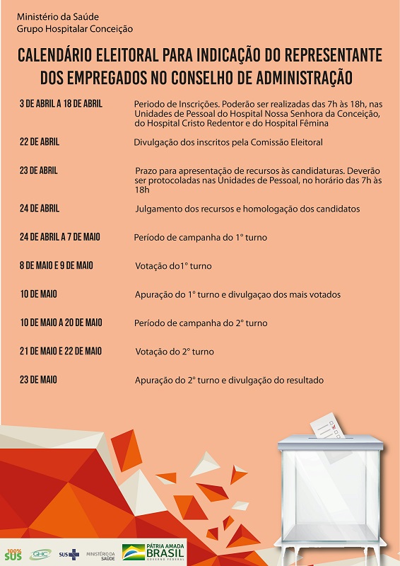 Foram prorrogadas até o dia 18 de abril as inscrições de candidatos a membro do Conselho de Administração pelos empregados do GHC, referente ao biênio 2019/2021. A decisão foi tomada pela Comissão Eleitoral após tomar conhecimento da suspensão da decisão judicial que afastava alguns dos requisitos e vedações da Lei nº 13.303, de 2016, ao indicado pelos empregados para compor o Conselho de Administração.
