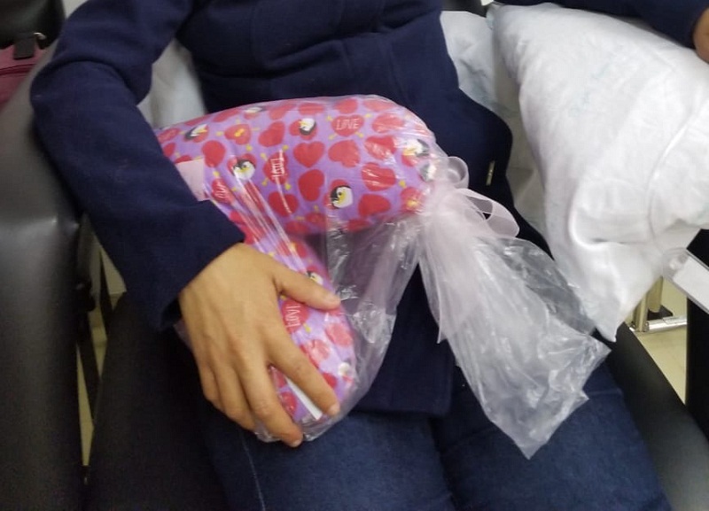 Na ação desta tarde, não foi diferente. Os jovens entregaram almofadas para as pacientes em tratamento no HF. A visita faz parte das atividades do Outubro Rosa na instituição.