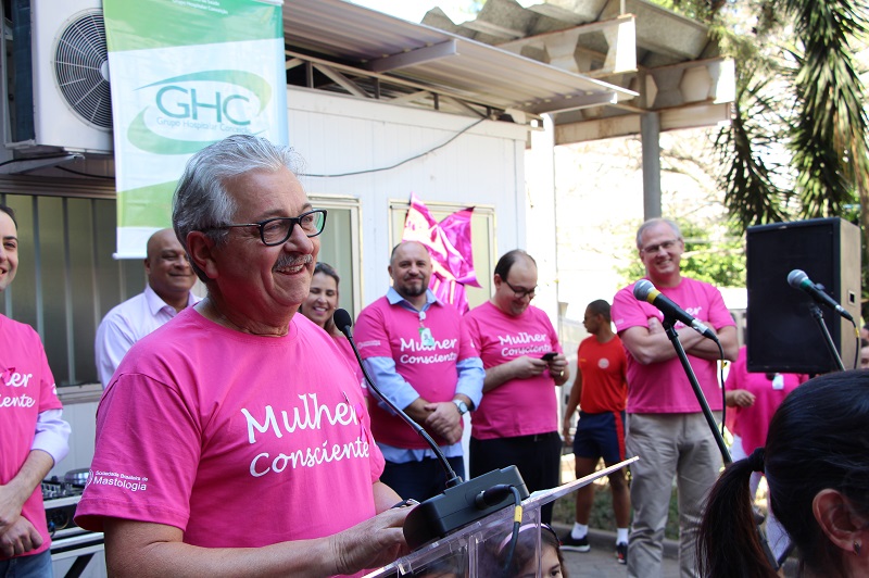 Em clima festivo e de integração, foi realizada na manhã desta sexta-feira, 25 de outubro, a 11ª Caminhada Mulher Consciente do Hospital Conceição (HNSC). Promovida pelo Setor de Mastologia do HNSC e pelas voluntárias do Grupo da Mama Conceição, a atividade busca conscientizar para o diagnóstico precoce e prevenção do câncer de mama. Com camisetas e adereços cor-de-rosa, o público teve concentração em frente ao hospital, onde assistiu ao show artístico do humorista Guri de Uruguaiana, do MC Jean Paul, do cantor Cris Fagundes e do coral Um Novo Horizonte do Centro de Convivência e Profissionalização (Ceconp/Fase). O momento proporcionou a animação de todos. Como tradicionalmente já ocorre, os bombeiros também participaram, incentivando as mulheres.