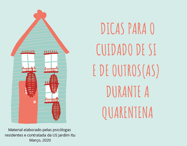 As psicólogas residentes da Residência Multiprofissional em Saúde do Grupo Hospitalar Conceição e contratadas da Unidade de Saúde Jardim Itu elaboraram recentemente material informativo sobre dicas para o cuidado de si e dos outros durante a quarentena. A publicação, que também traz orientações de como cuidar da saúde mental neste período de isolamento devido à pandemia, é dirigida aos profissionais de saúde e comunidades.