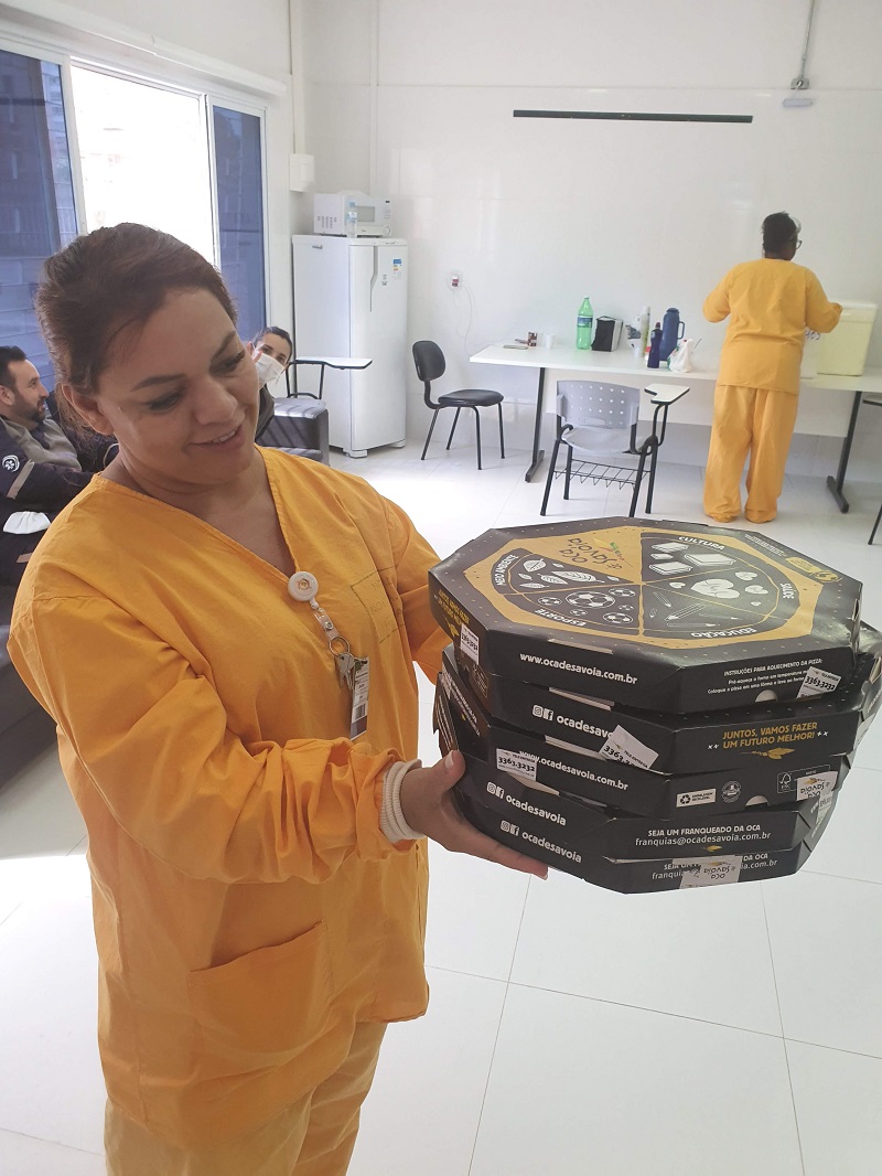 Ações como esta estão sendo realizadas desde início da pandemia. Na primeira semana de implantação, o Centro de Triagem da Covid-19 do GHC recebeu a doação de pizzas da empresa Oca da Savóia, distribuídas aos profissionais desta linha de frente.