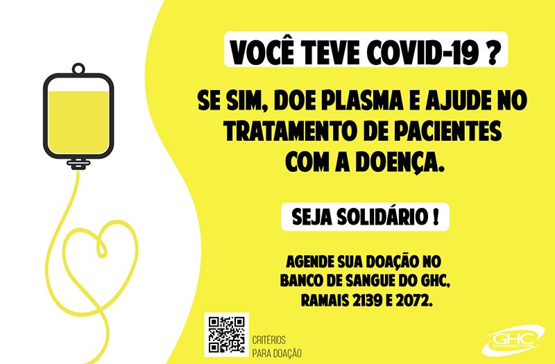 Para isso, o GHC adequou todos os serviços envolvidos e lança agora uma campanha para captação de doadores, especialmente entre os funcionários da instituição. O doador, além de possuir as condições básicas para doação de sangue (Clique aqui para saber), especificamente para a coleta de plasma convalescente para Covid-19 é necessário ainda: