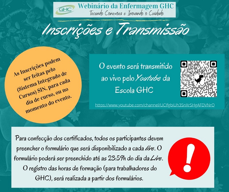 Para os interessados em participar do webinário, as inscrições para o evento já estão abertas pelo Sistema de Gestão de Cursos do GHC (SIN), no Minha Página, e também poderão ser realizadas no momento do evento. A transmissão do webinário será por meio do Youtube da Escola GHC. Link