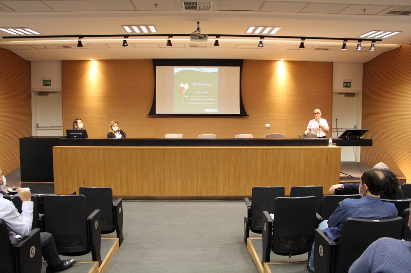Após, foi a vez das gerentes do Hospital Criança Conceição Lúcia Osório e Denise Braga apresentarem as iniciativas de qualificação do atendimento no HCC, como os programas Classe Hospitalar, Recreação Terapêutica e Pet-terapia, os grupos Dermatite Atópica, Atenção à AIDS Pediátrica, Doença Celíaca e Reabilitação de Anomalias Craniofaciais, a Linha de Cuidado da Obesidade, entre outros, que são diferenciais na assistência. Também foram apresentadas melhorias como a revitalização e a humanização dos ambientes.