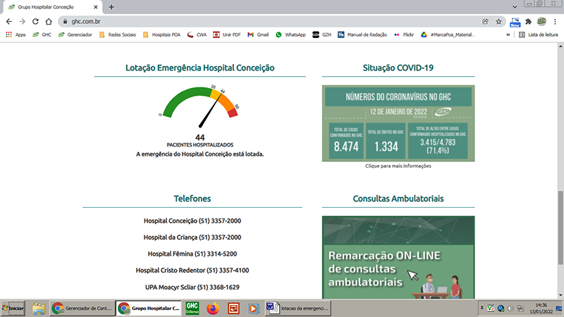 A Gerência de Interunidades de Emergências do Grupo Hospital Conceição, em parceria com a Gerência de Informática, volta a disponibilizar na página inicial do site do GHC a consulta à lotação da Emergência do Hospital Conceição, que agora pode ser acompanhada em tempo real. Ao abrir o endereço eletrônico www.ghc.com.br, o número de pacientes internados aparece na página inicial acompanhado de um ponteiro que indica, conforme a cor (amarelo, laranja, vermelho ou roxo), a situação da emergência. Quando estiver apontado para a cor laranja, por exemplo, significa que a emergência está restrita a casos graves.