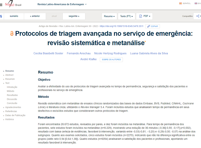 Foi publicado na Revista Latino-Americana de Enfermagem o artigo "Protocolo de triagem avançada no serviço de emergência: revisão sistemática e metanálise", de autoria dos profissionais da Escola GHC Me. Enf. Cecília Biasibetti Soster, Dr. Fernando Anchau e Dr. André Klafke, Luana Gabriela Alves da Silva e Nicole Hertzog Rodrigues.