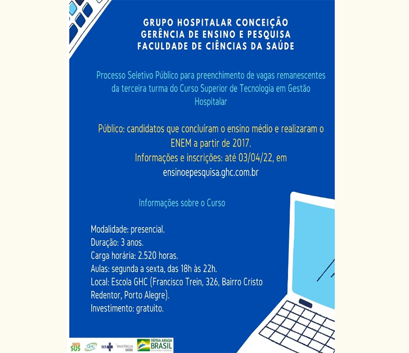 A gerente do Centro de Educação Tecnológica e Pesquisa em Saúde do Grupo Hospitalar Conceição, Bruna Donida, no uso de suas atribuições, torna público o presente Edital, contendo as normas referentes ao Processo Seletivo Público Simplificado para o preenchimento de vagas remanescentes para discentes da terceira turma do Curso Superior de Tecnologia em Gestão Hospitalar, nos termos da Lei nº 9.394/1996, dos Decretos nº 5.154/2004, Portaria MEC nº 413 de 11/05/2016 e da Portaria MEC nº 1537/2019 de 06/09/2019.