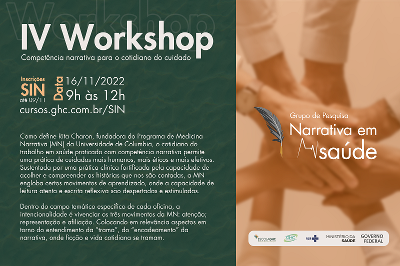 Gerência de Ensino e Pesquisa do Grupo Hospitalar Conceição divulga o 4º Workshop Narrativas em Saúde: Competência narrativa para o cotidiano do cuidado, que será realizado no dia 16 de novembro, das 9h às 12h.