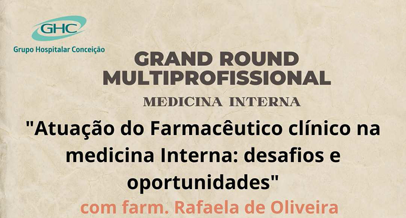 No dia 14 de junho, das 14h às 15h, a Medicina Interna do Hospital Conceição (HNSC) promoverá o Grand Round Multiprofissional, com o tema “Atuação do farmacêutico clínico na Medicina Interna: desafios e oportunidades”, apresentado pela farmacêutica Rafaela de Oliveira. O evento ocorrerá na sala 2 da GEP, no bloco H do HNSC.