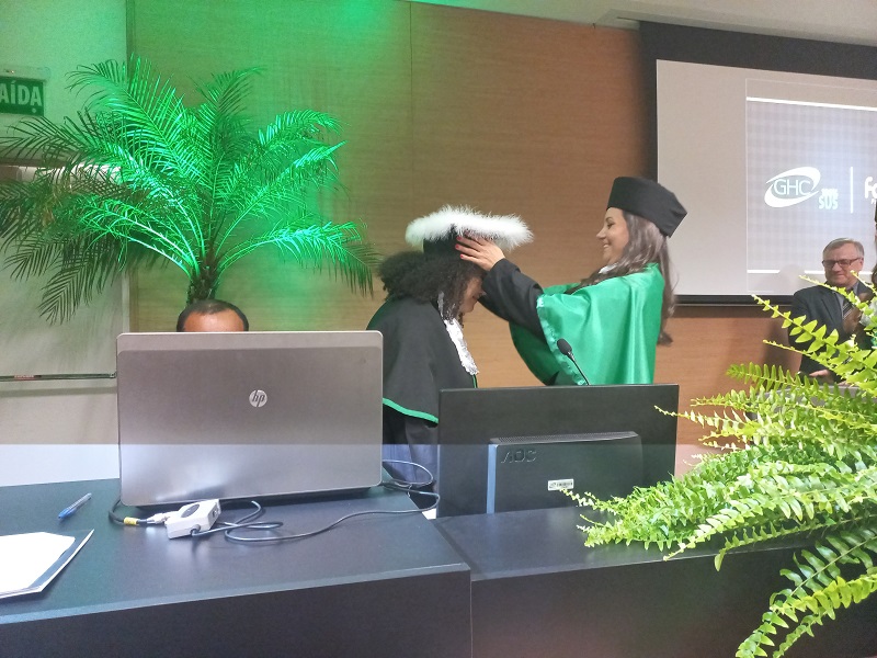 Entre os 17 alunos que colaram grau, duas são funcionárias da Higienização do Hospital Conceição. Lisiane da Silva da Rosa e Tanise Teresinha Chaves foram homenageadas pela Administração do HNSC, recebendo uma cesta cada uma.