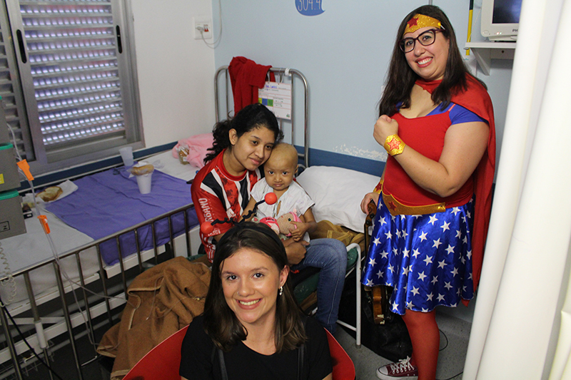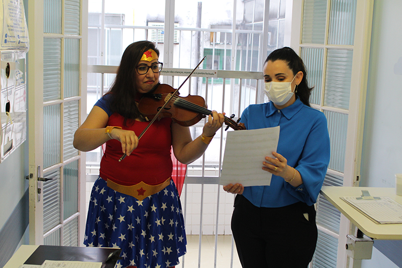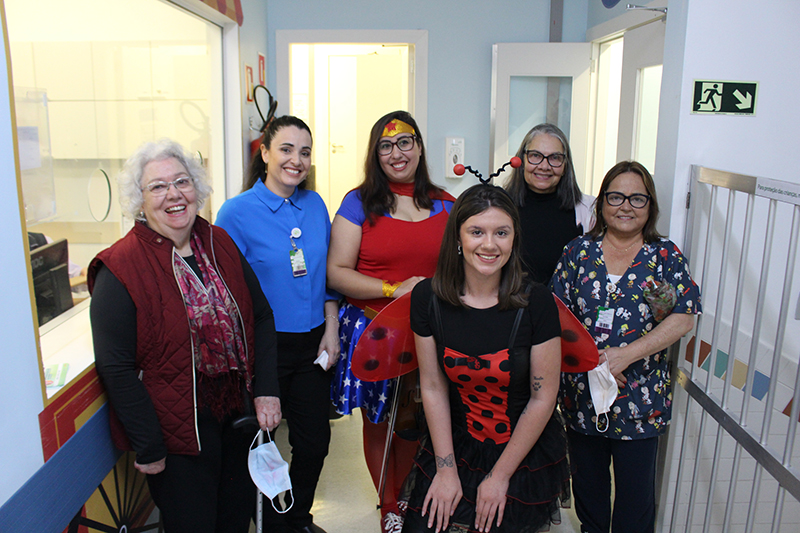 A enfermeira Loane Lindner se fantasiou de “Mulher-Maravilha” tocou as músicas “Aquarela”, de Toquinho e “Baby Shark” no violino, enquanto a estagiária Nicoly Coelho, vestida de “Joaninha”, passava nos leitos entregando brinquedos.