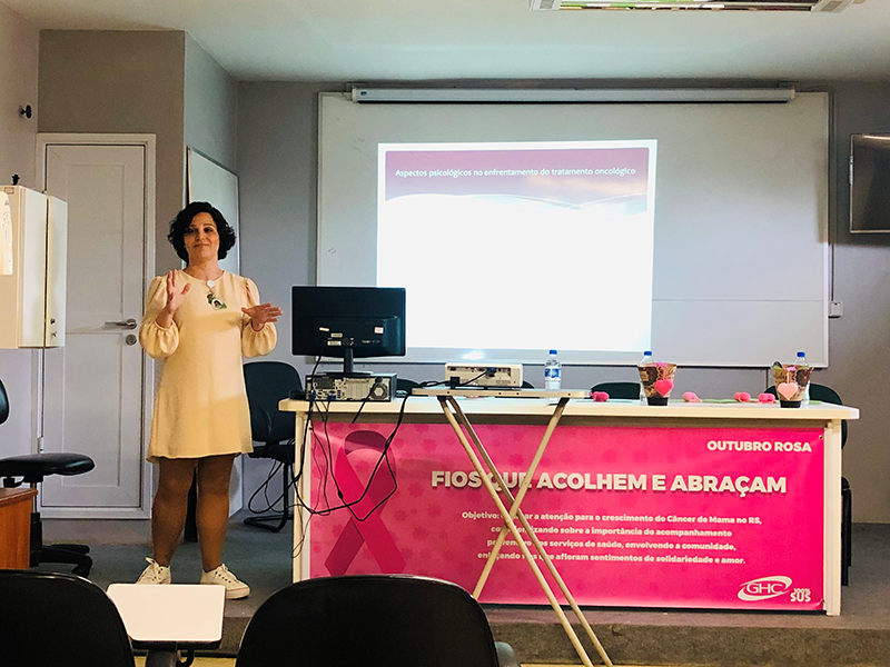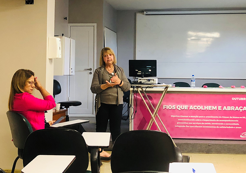A assistente social Marli Machado Silveira destacou o papel da assistência social na oncologia, detalhando sobre os processos, instâncias, direitos garantidos, fortalecimento e formação das redes de apoio das pacientes. “Muitas vezes, essa mulher é a base e é a mantenedora do lar. Precisamos estar atentos à vida econômica dessas famílias, respeitando suas pluralidades. Cada pessoa tem sua história, sua realidade e seu contexto”, explica Marli.