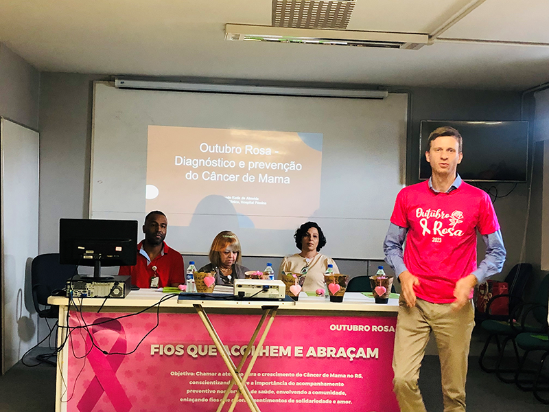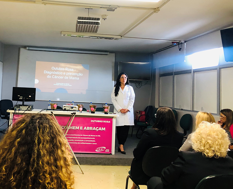 O médico oncologista Fernando Kude de Almeida palestrou sobre estatísticas de diagnóstico e sobrevivência, estruturas da mama, fatores de risco, tipos e estágios de cânceres de mama, prevenção primária e secundária. “Os exames preventivos não previnem a mulher de ter a doença, mas previnem as complicações, sequelas e mortes causadas pelo câncer de mama”, disse Almeida.