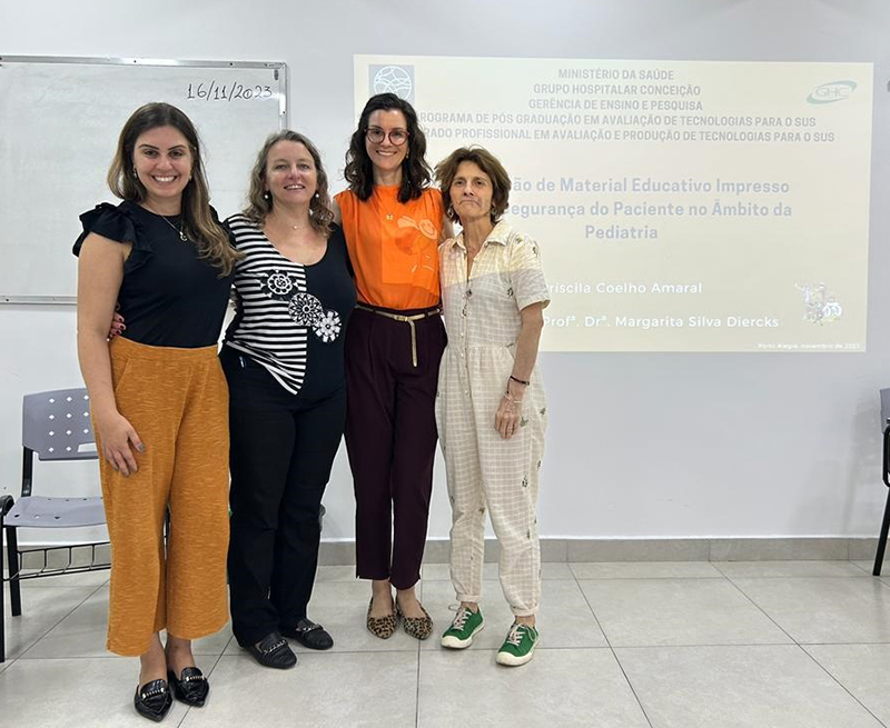 Foi realizada, no dia 16 de novembro, a apresentação pública da dissertação de mestrado da aluna Priscila Coelho Amaral do Mestrado Profissional em Avaliação e Produção de Tecnologias para o SUS do Hospital Nossa Senhora da Conceição - GHC intitulada "Validação de Material Educativo Impresso sobre segurança do paciente no âmbito da pediatria", com orientação da professora Margarita Diercks. Fizeram parte da banca os Doutores(as) Luciane Koppitke, Evelise Rigone de Faria e Victor Grabois.