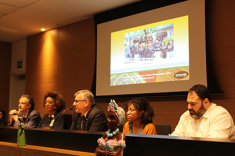 Além da diretora de Inovação, Gestão do Trabalho e Educação do GHC, Quelen Silva, a mesa de abertura do evento foi composta pelo diretor-presidente do GHC, Gilberto Barichello, o gerente de Participação Social e Diversidade do GHC, Eduardo Freire, o diretor Administrativo e Financeiro do GHC, João Motta, e a presidente da Ceppir/GHC, Andréia de Oliveira.