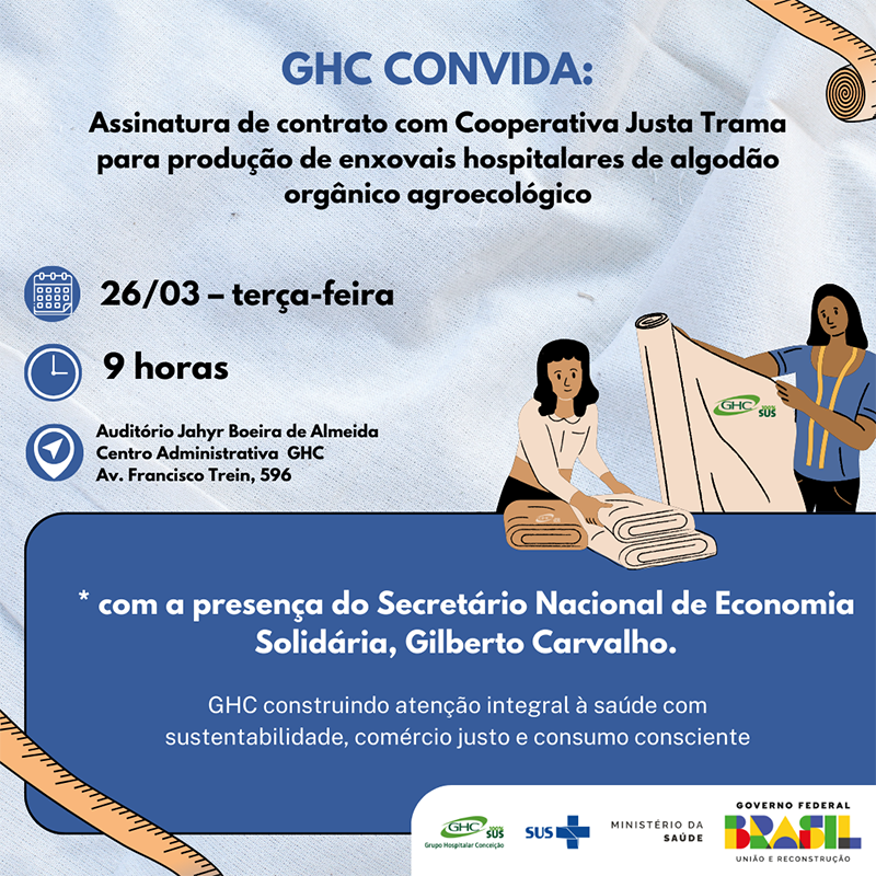 Na próxima terça-feira, 26/03, o Hospital Conceição, vinculado ao Grupo Hospitalar Conceição/Ministério da Saúde, assinará contrato com a Cooperativa Central Justa Trama para o fornecimento de peças de enxovais hospitalares a partir de algodão orgânico agroecológico. Pelo contrato, serão confeccionadas mensalmente 100 fronhas de algodão orgânico agroecológico, 300 lençóis adulto de algodão orgânico agroecológico e 300 lençóis infantis em tecido de algodão orgânico agroecológico, totalizando o valor de R$ 290.700,00.