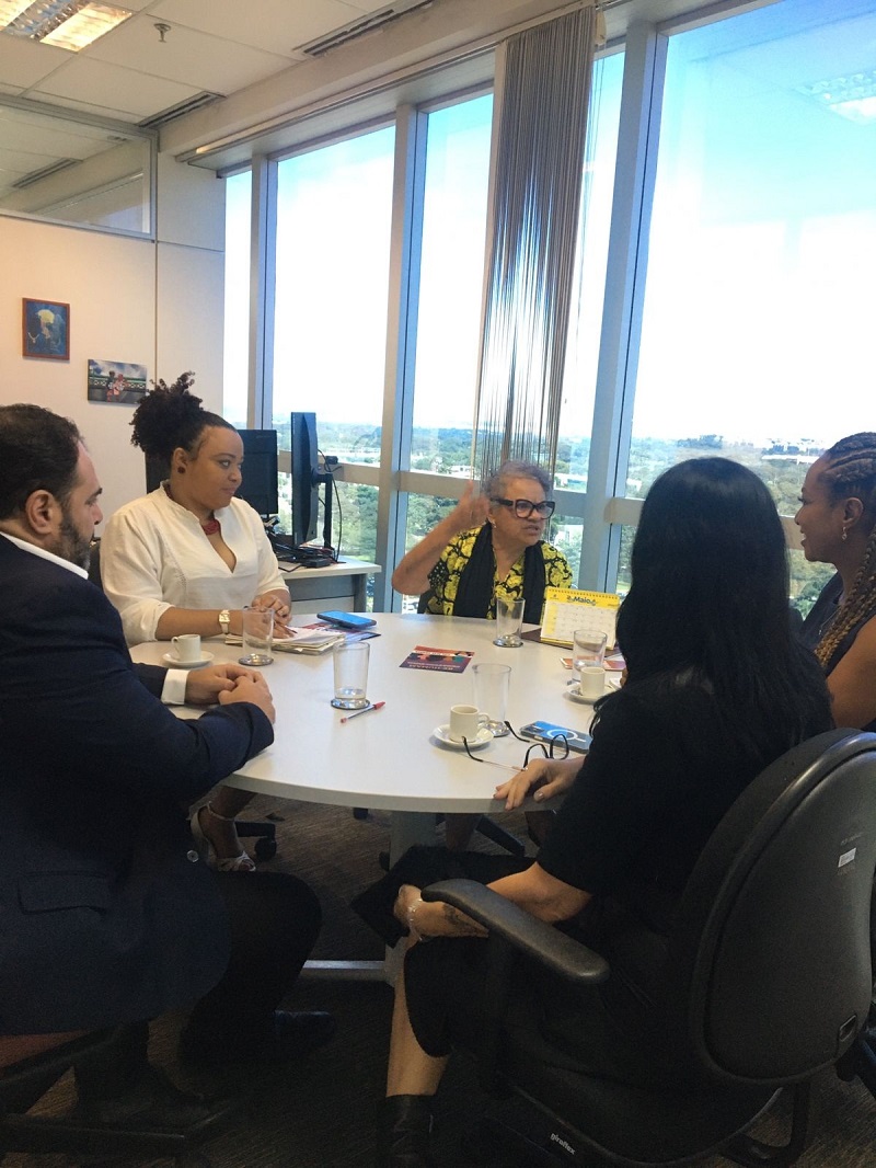 Ainda em Brasília, a equipe do GHC participou de reunião no Ministério da Igualdade Racial com a diretora de Articulação Interfederativa da Secretaria de Gestão do Sistema Nacional de Promoção da Igualdade Racial, Isadora Bispo, e a coordenadora da Diretoria de Articulação Interfederativa do MIR, Leonice Aparecida de Fátima Alves Pereira Mourad. O encontro teve como objetivo o fortalecimento de parcerias entre as instituições em relação às pautas raciais, como a realização de atividades e capacitações para os trabalhadores da área da saúde.
