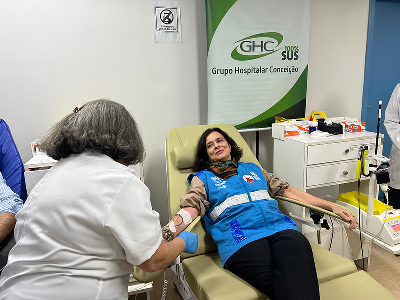O Dia Mundial do Doador de Sangue, comemorado nesta sexta-feira, 14 de junho, teve uma protagonista especial no Grupo Hospitalar Conceição (GHC). No início da tarde, a ministra da Saúde, Nísia Trindade, compareceu ao Banco de Sangue do Hospital Conceição na condição de doadora. “O gesto da ministra é um exemplo de solidariedade ao povo gaúcho, nestes tempos difíceis que o Rio Grande do Sul está enfrentando”, destaca o diretor-presidente do Grupo, Gilberto Barichello.