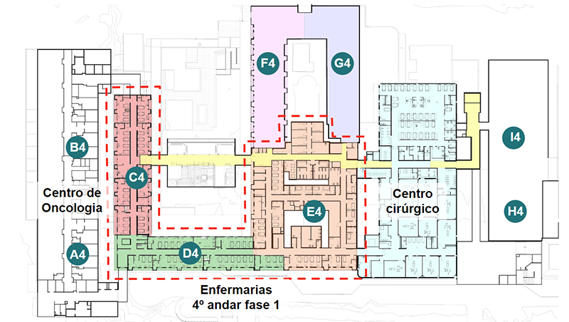 As enfermarias C4, D4 e E4 contarão com 25, 27 e 24 leitos respectivamente, totalizando 76 leitos, 3 postos de enfermagem, salas de utilidades, banheiros, depósitos de materiais de limpeza, depósitos, salas de exames e curativos, processamento de roupas. Além disso, haverá salas destinadas aos serviços assistenciais, também faz parte do projeto reformar as salas administrativas e copa.