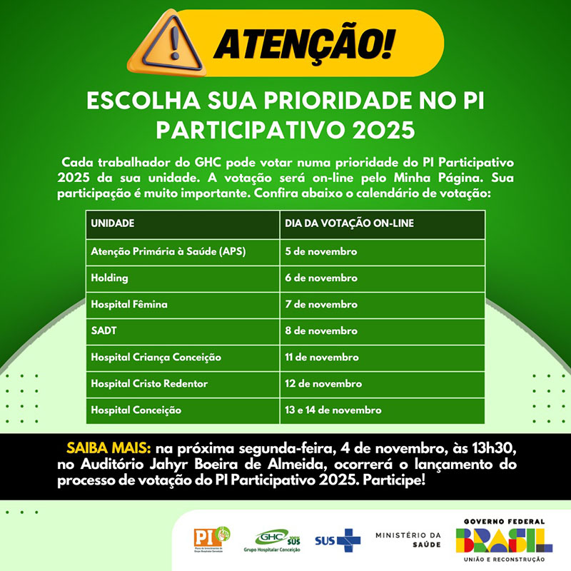 A definição do Plano de Investimentos (PI) Participativo do Grupo Hospitalar Conceição (GHC) para 2025 entra na reta final. Na próxima segunda-feira, dia 4 de novembro, às 13h30, no Auditório Jahyr Boeira de Almeida, será apresentado o calendário de votação das prioridades. O processo de escolha será realizado de forma on-line por unidade e cada funcionário (a) poderá votar em uma proposta, de 5 a 14 de novembro, conforme cronograma abaixo, pelo Minha Página.