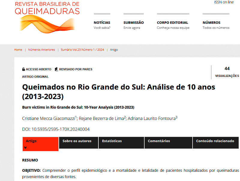 Recentemente, três profissionais do Grupo Hospitalar Conceição (GHC) publicaram um artigo na Revista Brasileira de Queimaduras, com o tema “Queimados no Rio Grande do Sul: análise de 10 anos (2013 a 2023)”. No artigo, a cirurgiã dentista Rejane de Lima e as fisioterapeutas Adriana Fontoura e Cristiane Giacomazzi destacam achados importantes para a área da saúde.