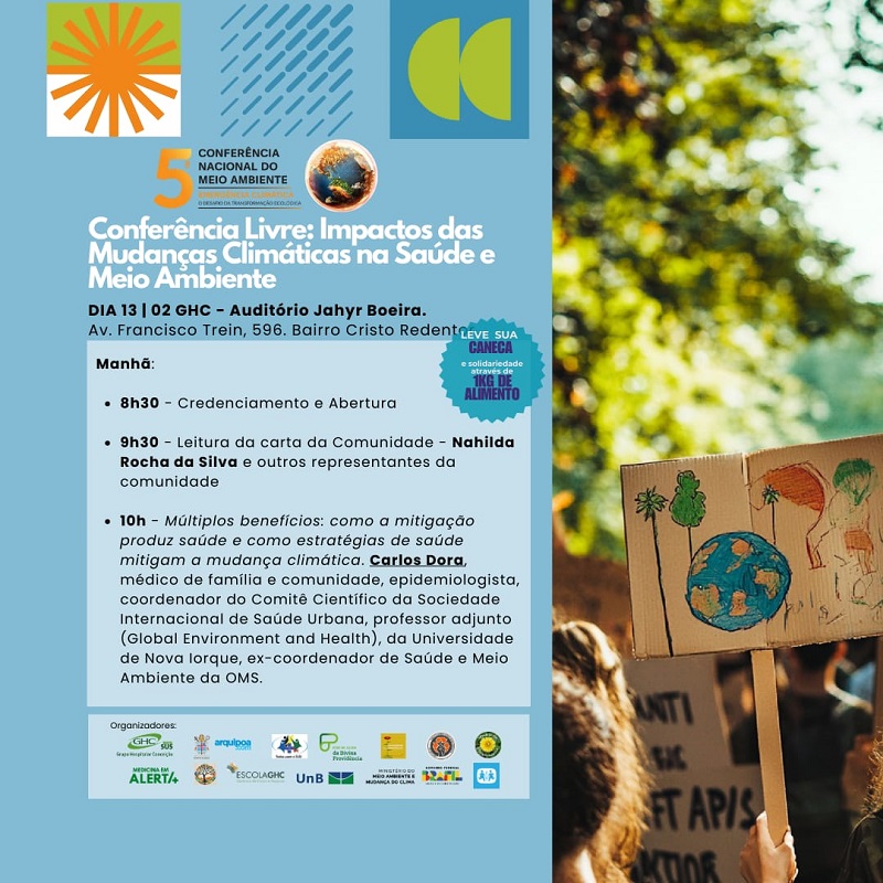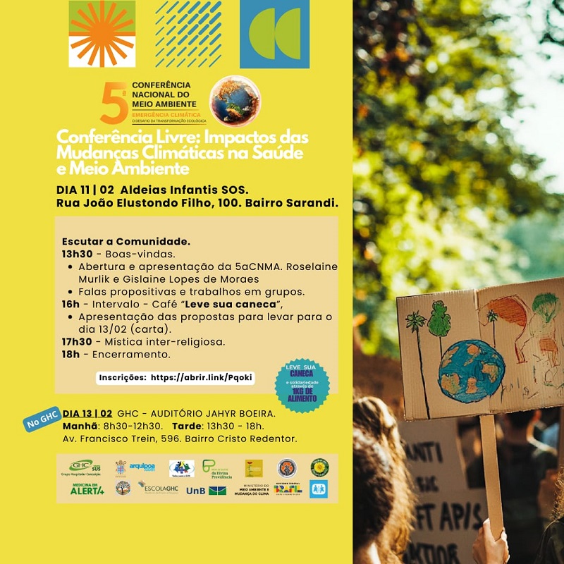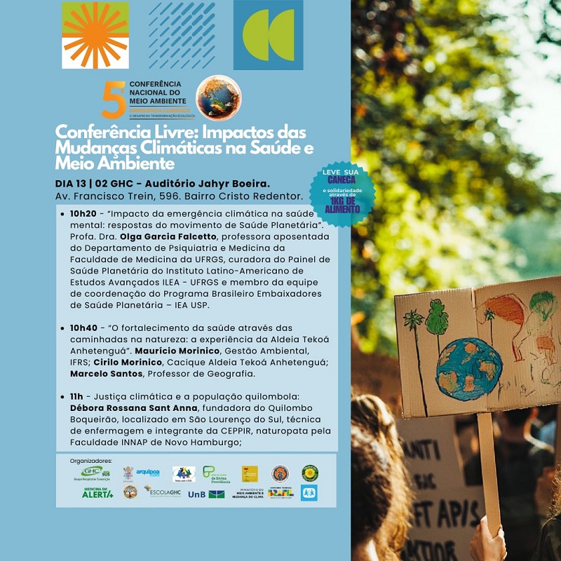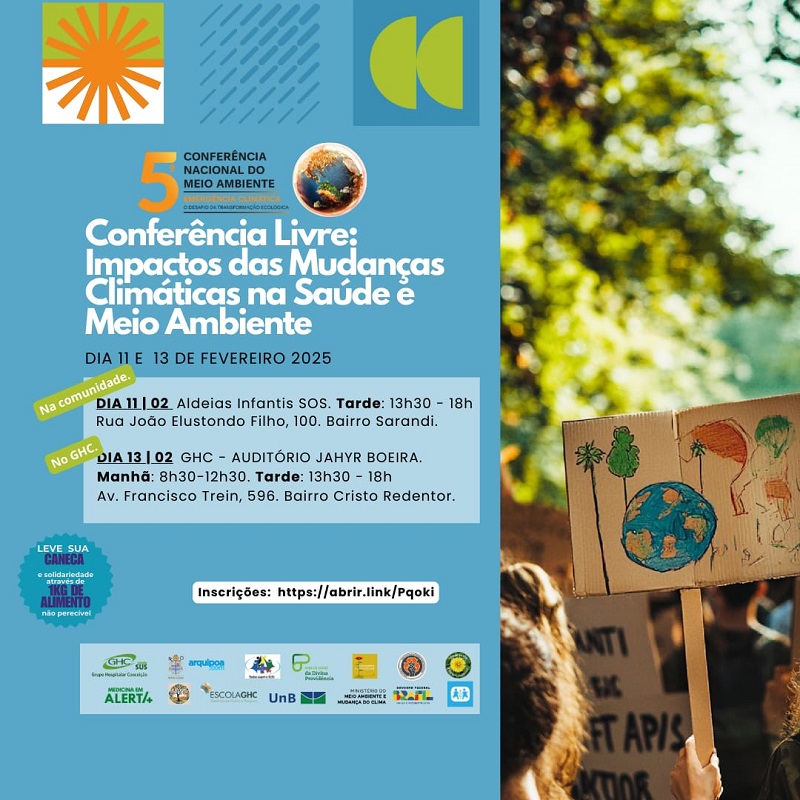 Será realizada, nos dias 11 e 13 de fevereiro, a Conferência Livre: Impactos das Mudanças Climáticas na Saúde e no Meio Ambiente, promovida pelo GHC em conjunto com outras entidades, com o objetivo de debater com profissionais de saúde, estudantes, povos originários e tradicionais sobre a concepção do ser humano integral em composição com a natureza; o impacto das mudanças climáticas na saúde e estratégias de adaptação e mitigação para seu enfrentamento.