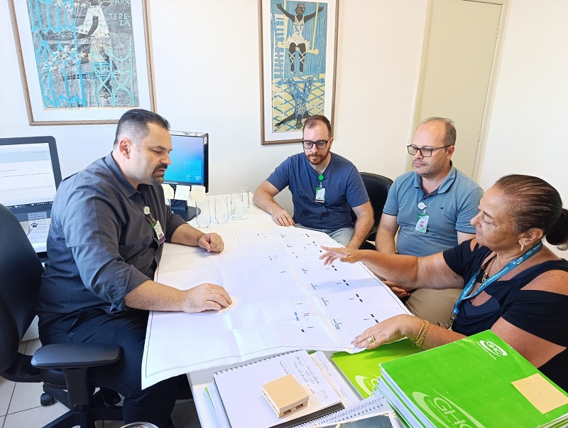 Os gestores do Hospital Fêmina (HF/GHC) estão adotando medidas emergenciais para enfrentar os dias de calor intenso registrados nos últimos dias no Rio Grande do Sul. Com a presença dos engenheiros Isar Rosenberg e João Schultz, acompanhados pelo chefe da manutenção da instituição, Leandro Schumacher, foi realizada, na terça-feira (11/2), uma visita técnica no 6º andar. Eles também se reuniram com o gerente de Administração, Cláudio Silva, para apresentar o projeto técnico de climatização da área.