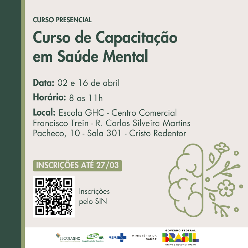 O Grupo Hospitalar Conceição está promovendo um curso de capacitação em Saúde Mental, na modalidade presencial, com o médico psiquiatra Luiz Ziegelmann. As inscrições vão até o dia 27 de março. O curso ocorrerá no período da manhã, das 8h às 11h, nos dias 2 e 16 de abril, na Escola do GHC, no Centro Comercial Francisco Trein, Rua Carlos Silveira Martins Pacheco, 10, sala 301.