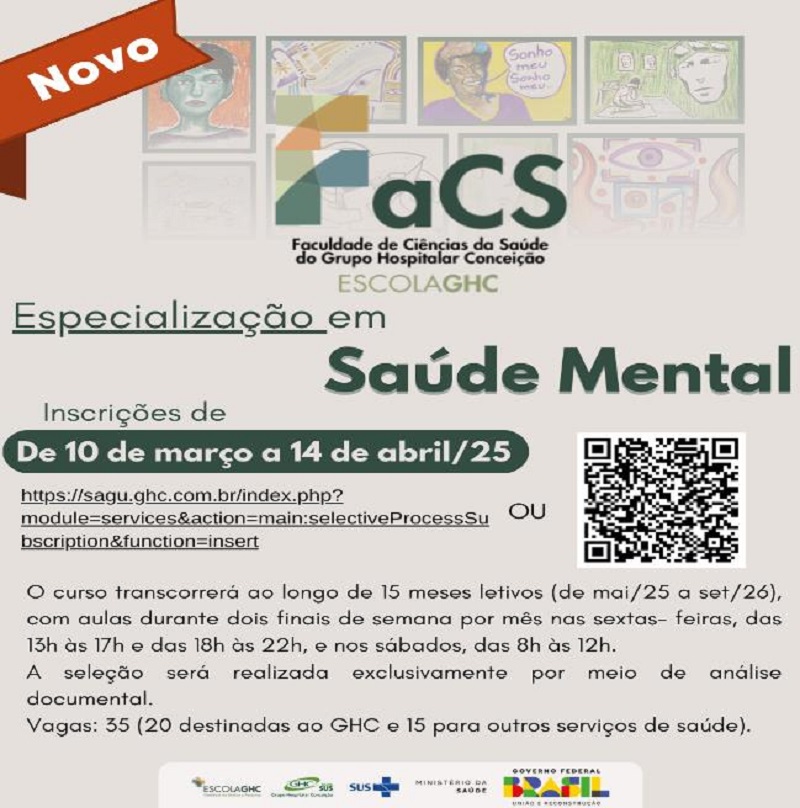 A Escola do Grupo Hospitalar Conceição (Escola GHC), por meio da Faculdade de Ciências da Saúde (FaCS-GHC), em conformidade com a Resolução do Ministério da Educação nº 1, de 6 de abril de 2018, promoverá o Curso de Especialização em Saúde Mental em nível de pós-graduação lato sensu. O objetivo é qualificar profissionais para a promoção de cuidados em saúde mental em consonância como o estabelecido na Portaria do Ministério da Saúde nº 3.088/2011, que institui a Rede de Atenção Psicossocial (RAPS), e para o desenvolvimento de ações que impactem sobre os atuais determinantes da saúde mental em consonância com a Reforma Psiquiátrica.