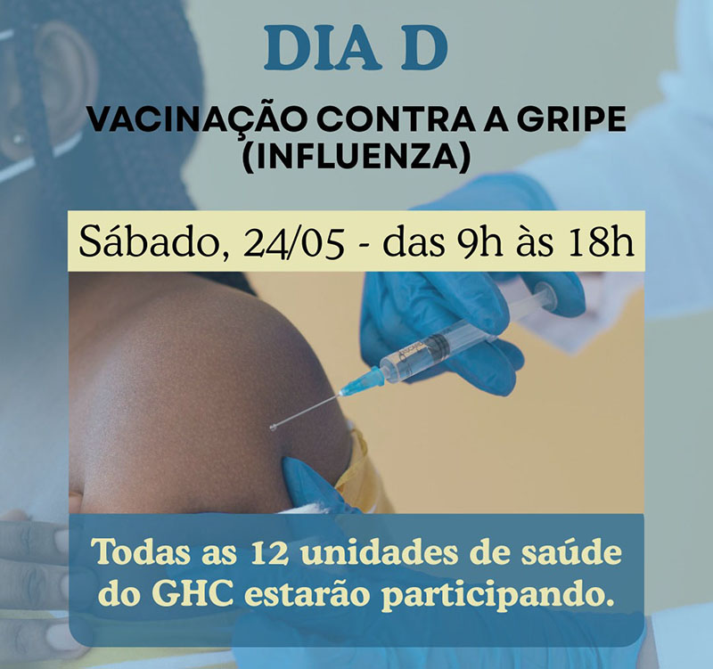 Todas as doze Unidades de Saúde da Atenção Primária do Grupo Hospitalar Conceição estarão participando do Dia D de vacinação contra a gripe (Influenza), neste sábado, dia 24 de maio, em Porto Alegre. Os postos vão estar abertos durante todo o dia, das 9h às 18h. A vacina estará disponível para todas as pessoas com mais de seis meses de idade.