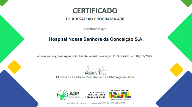 Na última sexta-feira, 4 de julho, foi publicado no Diário Oficial da União o Termo de Adesão do Hospital Nossa Senhora da Conceição (HNSC) ao programa Agenda Ambiental na Administração Pública (A3P). O termo tem como finalidade unir esforços para desenvolver projetos destinados à implantação do Programa A3P no âmbito do GHC, visando à inserção da variável socioambiental no seu cotidiano e na qualidade de vida do ambiente de trabalho.
