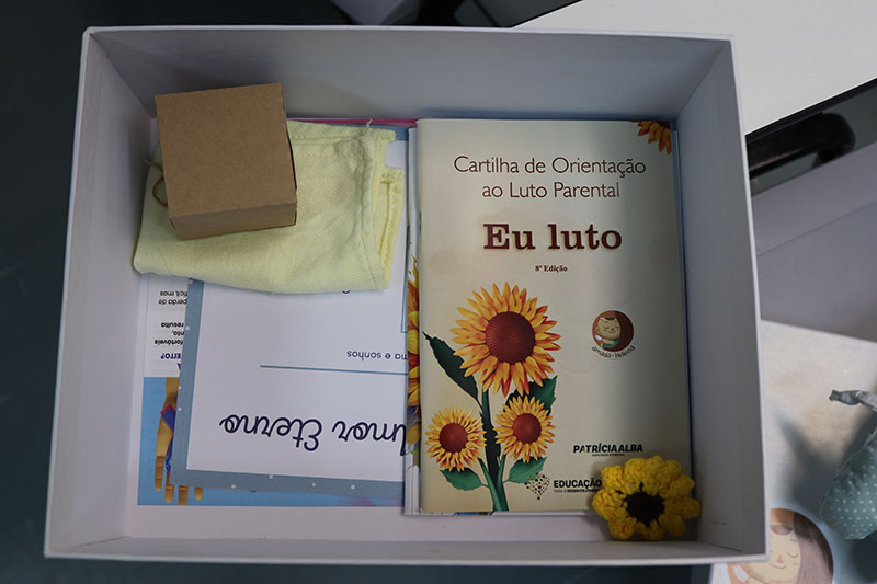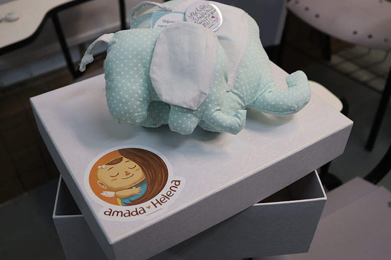 Ao final da aula, ocorreu a doação pela ONG de caixas personalizáveis, com elefantes de pelúcia, panos de “cheirinho”, quadro do pezinho e outros itens para guardar memórias dos bebês.