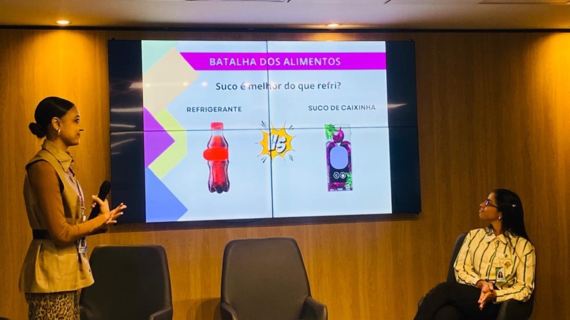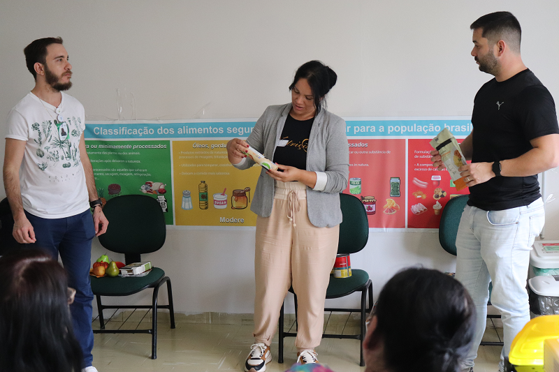 Os nutricionistas também reforçaram a importância de ler os rótulos dos alimentos. A análise da lista de ingredientes permite identificar produtos ultraprocessados, que muitas vezes são comercializados como opções saudáveis. Para ilustrar o tema, foi proposta uma dinâmica em que o público recebeu quatro alimentos e teve de ler os ingredientes e classificá-los conforme os grupos do guia.