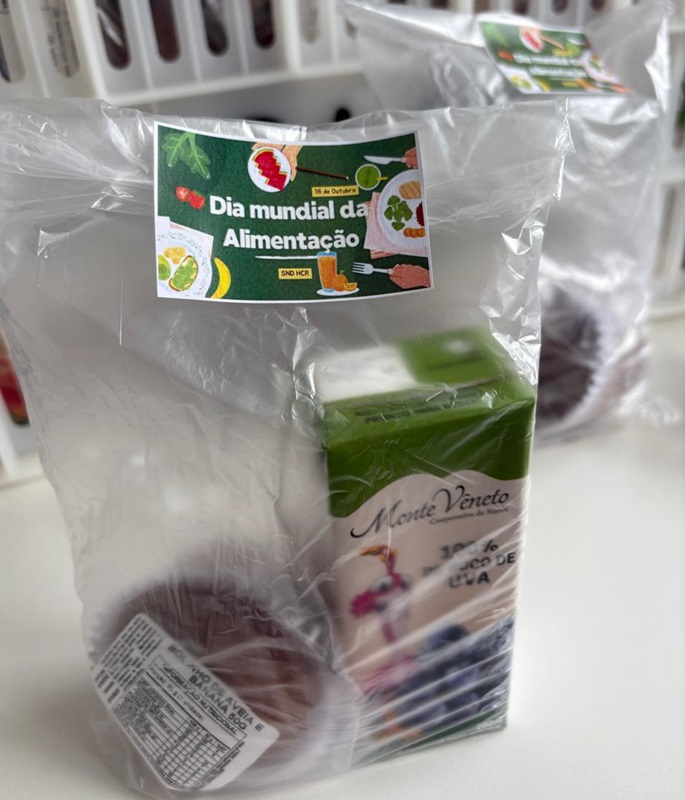 Os trabalhadores do Hospital Cristo Redentor contaram com um almoço especial e receberam um kit com produtos da agricultura familiar, contendo suco integral e bolo de aveia com banana. No refeitório, displays de mesa e cartazes orientaram sobre os pilares do Guia Alimentar para a População Brasileira e os malefícios dos ultraprocessados para a saúde.