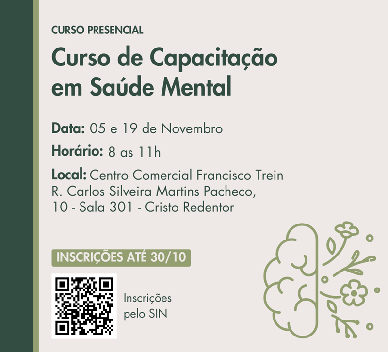 O Grupo Hospitalar Conceição (GHC) está promovendo um curso de capacitação em Saúde Mental, na modalidade presencial, com o médico psiquiatra Luiz Ziegelmann. As inscrições já estão abertas e vão até o dia 30 de outubro. O curso ocorrerá no período da manhã, das 8h às 11h, nos dias 5 e 19 de novembro na Escola do GHC, no Centro Comercial Francisco Trein, Rua Carlos Silveira Martins Pacheco, 10, sala 301.