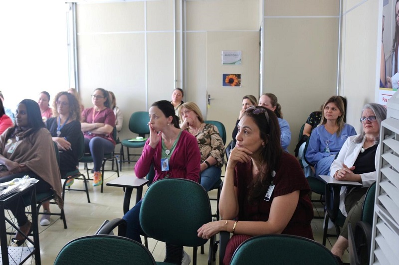 Durante o momento da palestra, profissionais compartilharam experiências sobre a atuação da equipe do Fêmina em casos de perda gestacional. A psicóloga orienta a sensibilidade dos profissionais com as famílias em todas as etapas, desde a comunicação do óbito até o acompanhamento psicológico pós-alta. Oferecendo orientações sobre como lidar com o enxoval e o quarto do bebê, a possibilidade de realizar despedidas simbólicas, registrar o nome do filho e participar da despedida. “A perda não foi uma escolha dos pais, não há pressa. Cada família tem seu tempo para elaborar esse processo”, destacou a palestrante.