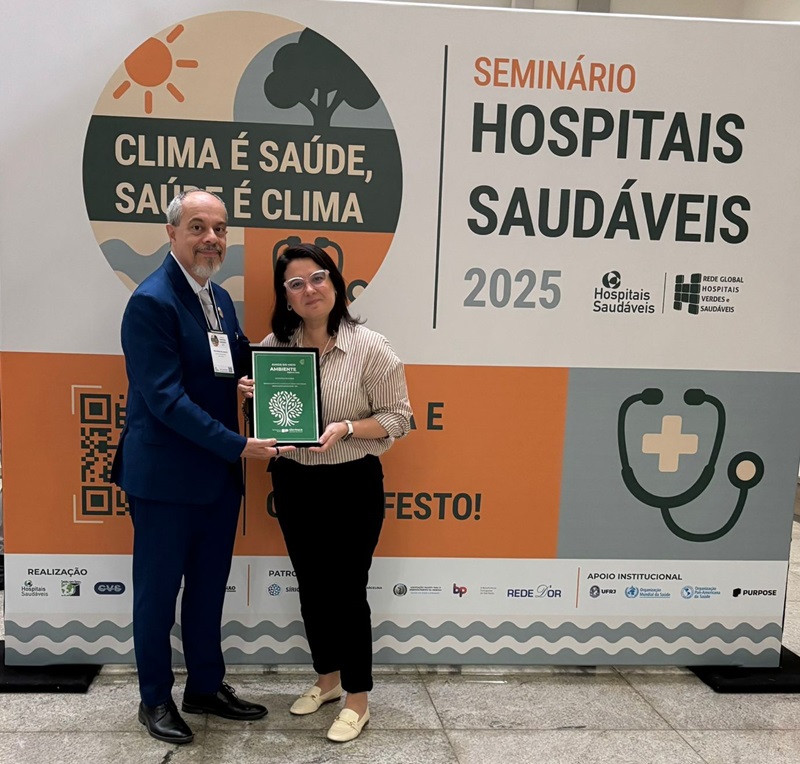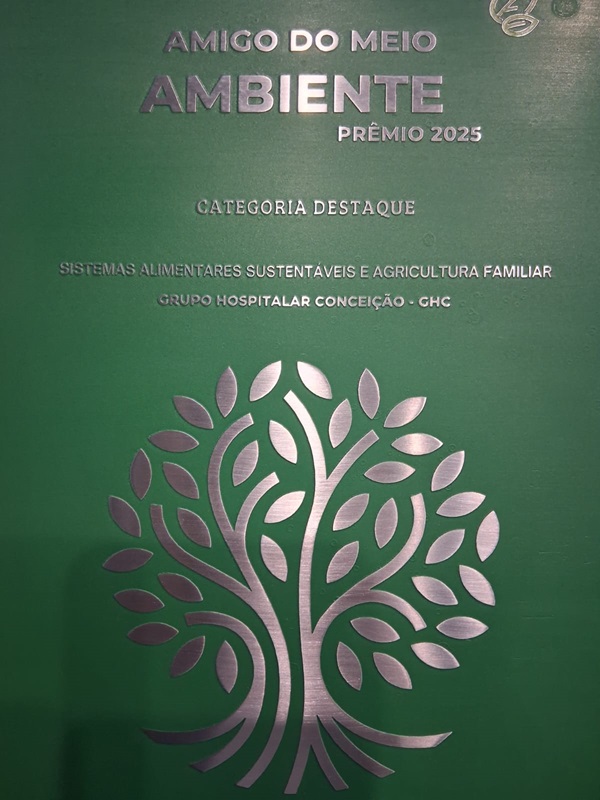 O Grupo Hospitalar Conceição (GHC) foi selecionado entre as 15 melhores instituições do país no Prêmio Amigo do Meio Ambiente – PAMA 2025 pelo projeto “Sistemas Alimentares Sustentáveis no Contexto Hospitalar: a Experiência do GHC com a Agricultura Familiar”. O projeto foi subscrito pela cordenadora de Nutrição do Hospital Nossa Senhora da Conceição (HNSC), Marília Unello Garcez, pelo chefe de gabinete do GHC, Alex Borba dos Santos, e pelo gerente de Administração do HNSC, Alvarim Severo. Marília e Alex representaram o GHC na entrega do Prêmio, ocorrida nessa terça-feira (28).