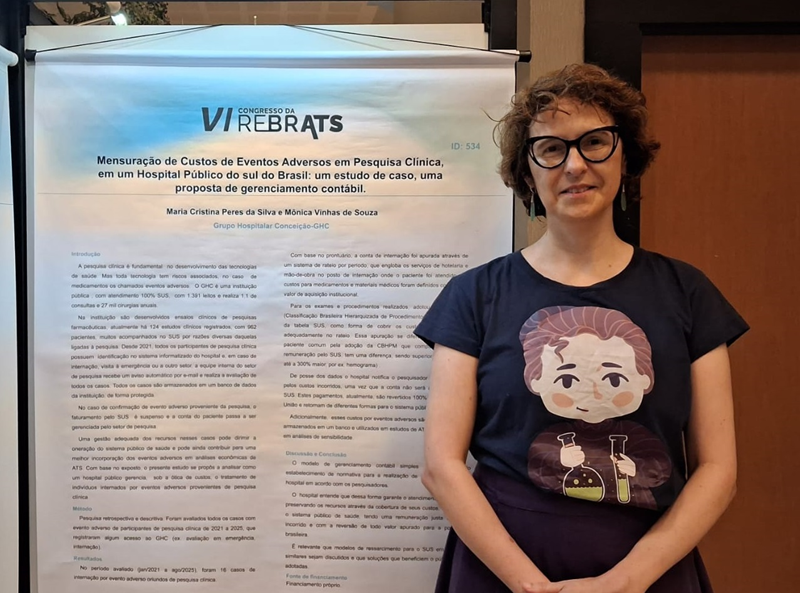 O Núcleo de Avaliação de Tecnologias em Saúde do Grupo Hospitalar Conceição (NATS-GHC) se fez presente tendo apresentado, no formato de pôster, o trabalho “Mensuração de Custos de Eventos Adversos em Pesquisa Clínica, em um Hospital Público do sul do Brasil: um estudo de caso, uma proposta de gerenciamento contábil”, de autoria da administradora e mestre em Tecnologias da Informação e Gestão Maria Cristina Peres da Silva e apresentado pela dra. Mônica Vinhas de Souza, ambas integrantes do Setor de Pesquisa e Inovação da Escola GHC e do NATS-GHC.