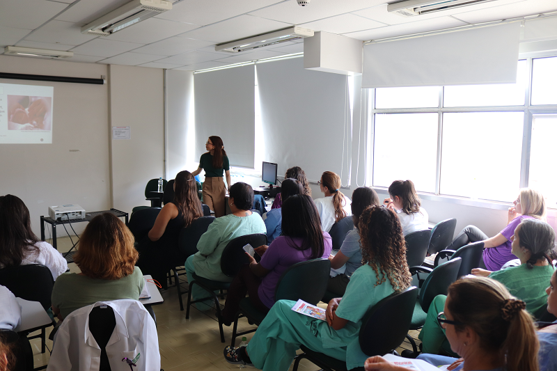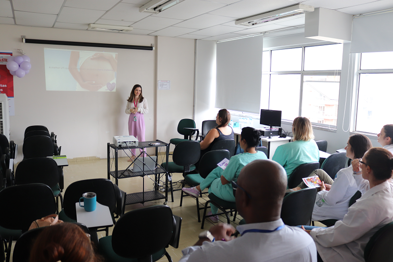 A enfermeira intensivista da UTI Neonatal Ana Luiza Dias realizou a palestra “Aleitamento de recém-nascidos prematuros”, onde destacou os benefícios do leite materno para os bebês prematuros. “A amamentação previne a ocorrência de doenças neonatais e serve como uma proteção contra o desenvolvimento de sepse tardia e enterocolite, que são os principais riscos para o recém-nascido durante a internação na UTI Neonatal.” Ainda, reforçou a importância da atuação do banco de leite humano.