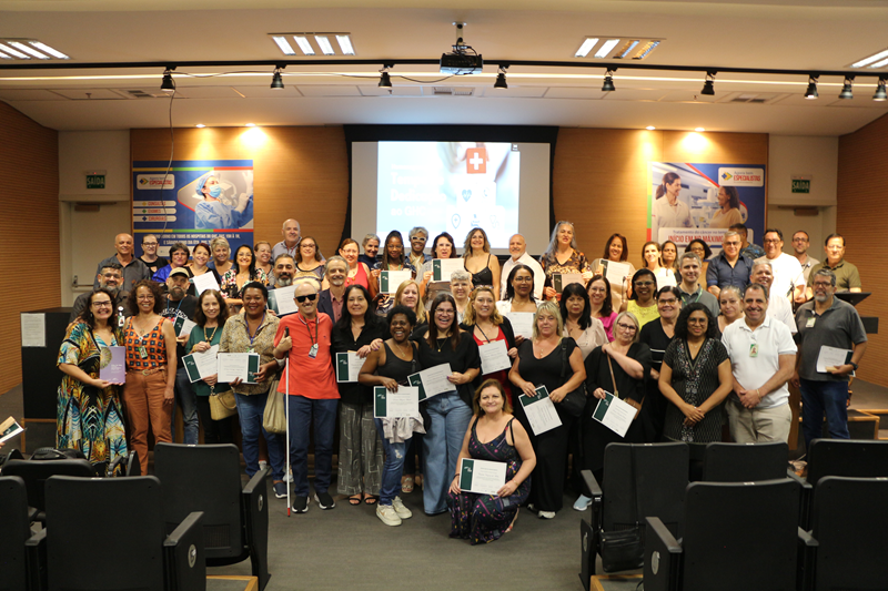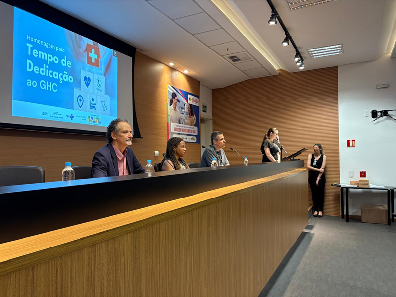 Presentes na solenidade, a diretora de Inovação, Gestão do Trabalho e Educação do GHC, Quelen Tanize Alves da Silva, o diretor Administrativo e Financeiro do GHC, João Motta, a diretora de Atenção à Saúde do GHC, Rosana Nothen, e o representante da Gerência de Gestão de Pessoas, Rodrigo Casagrande, agradeceram a todos pelos serviços prestados ao Grupo Conceição em todo o tempo de vínculo.