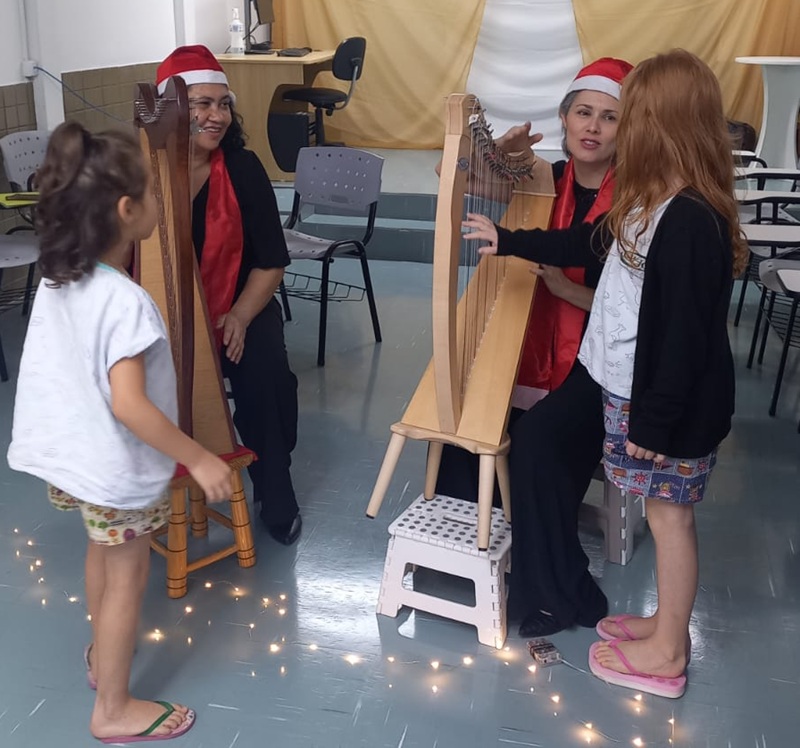 Na última semana, o bom velhinho circulou pelo Ambulatório de Especialidades do Hospital Nossa Senhora da Conceição (HNSC) e no Centro de Oncologia e Hematologia, alegrando os usuários que aguardavam consultas. Nesta terça-feira (9), foi a vez dos pacientes do Hospital Criança Conceição (HCC) participarem de atividade apresentação musical com o coletivo de artistas brincantesToque de Comadre e assistirem a um duo de harpas com as musicistas Nara Rosa, que também é funcionária do GHC, e Letícia Piasentin.