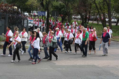 Nesta quinta-feira, 10 de outubro, o Hospital Conceição (HNSC) realizou a “Caminhada pela Vida”, reunindo dezenas de pessoas em defesa da luta contra o câncer. A ação que marca o Outubro Rosa faz um alerta sobre a importância da detecção precoce da doença, promovida pelo Grupo Voluntárias da Mama e dos serviços de Mastologia e de Onco-hematologia, da Comissão de Controle de Tabagismo e da Administração do HNSC. Em frente à instituição, os participantes praticaram exercícios de aquecimento com a professora de ginástica Silvana Souza, antes de começar o percurso que teve como ponto final, o Shopping Bourbon Country.