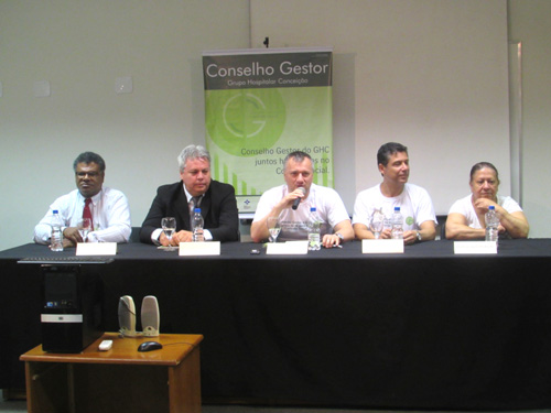 A abertura do evento contou com a participação do diretor administrativo e financeiro do GHC, Gilberto Barichello, o gerente de Administração do Hospital Conceição, Alexander Cunha, o gerente de Administração do Hospital Criança Conceição, Mauro de Paula, a coordenadora do Conselho Municipal de Saúde, Djanira Correa da Conceição, e o coordenador do Conselho Gestor do Hospital Cristo Redentor, Paulo Roberto Padilha. Gilberto Barichello falou sobre a importância da participação dos usuários do SUS para definir os rumos da saúde. “O Conselho Gestor é um exemplo do exercício de democracia e de cidadania no GHC”, explica Barichello. Alexander Cunha destacou os avanços e desafios que fazem parte da trajetória do conselho. “Estamos preparando uma nova sala para o Conselho Gestor do HNSC em local de fácil acesso para a comunidade”, anunciou o gerente.