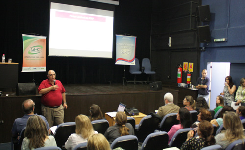 Na abertura do evento, a coordenadora do Gerenciamento de Risco do GHC, Rosana Mirandola, destacou a necessidade de alterar os métodos de atendimento em se tratando de segurança do paciente: “Muitas vezes, a segurança do paciente não depende apenas de grandes investimentos financeiros, e sim de uma mudança no processo de trabalho”, explica. Compondo a mesa de abertura ao lado dela, estava o gerente de Apoio do GHC, Márcio Belloc.